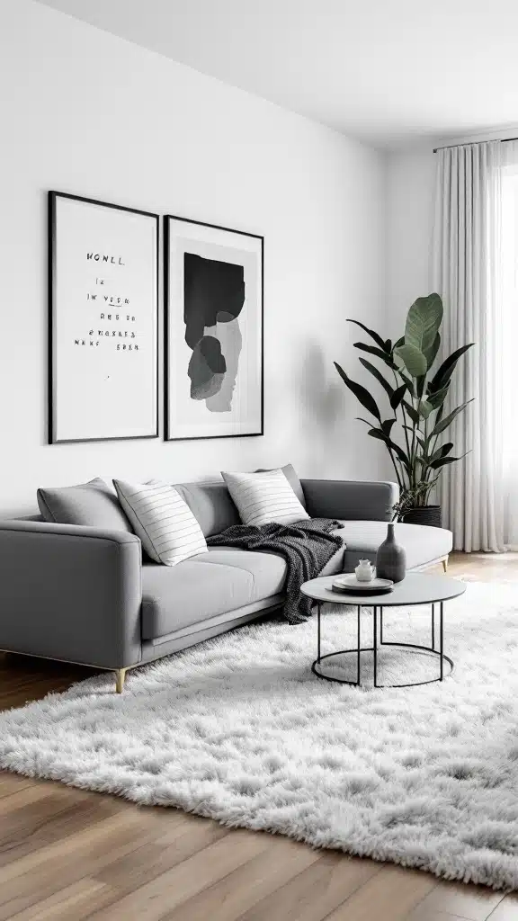 Contemporary Minimalist Charm thrives on a streamlined black-and-white palette, with a sleek grey couch commanding attention as the stylish focal point. The clean lines of a modern glass coffee table blend effortlessly with monochrome artwork, creating visual balance. A plush white area rug softens the space, while subtle greenery accents inject a refreshing touch of life. This uncluttered and serene design radiates sophistication, making it ideal for anyone seeking timeless simplicity and modern elegance in their living room decor.