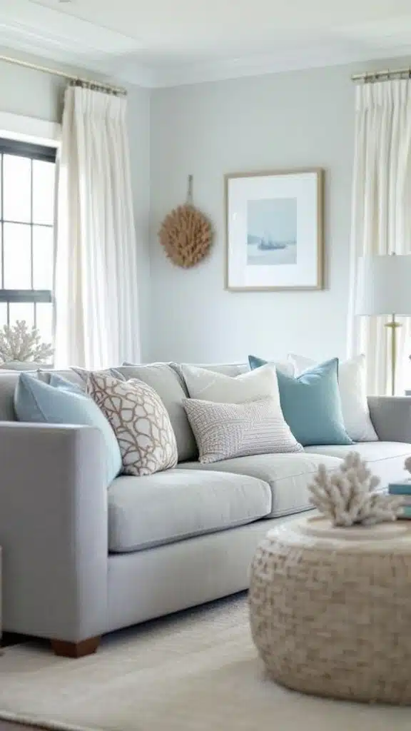 Modern Coastal Cool blends a grey couch with aqua cushions to instantly evoke the serenity of seaside living. The calming color palette is complemented by light wood furniture that brings warmth and balance, while airy linen curtains enhance the breezy atmosphere. Small accents like coral sculptures or nautical prints tie the look together, reflecting the ocean without feeling overly thematic. This setup is effortlessly chic, creating a relaxing and sophisticated coastal vibe perfect for any home.
