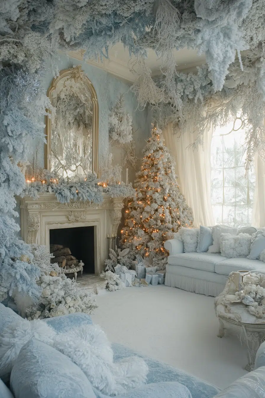 Create a dreamy winter retreat with an enchanting christmas aesthetic that transforms your living room into a wonderland. Embrace the magic with affordable white lights, paper snowflakes, and silver accents from the dollar store. Add coziness with soft throws and DIY winter crafts that sparkle in the evening light.