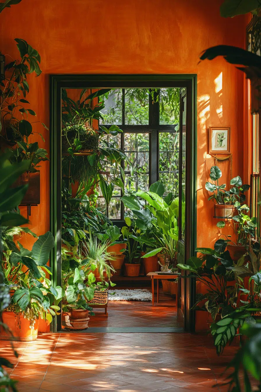 Transform your bedroom into a tropical escape with vivid green plants against terracotta walls in a green and terracotta bedroom. This dynamic contrast fosters a lush, relaxing ambiance. Use light, breathable fabrics and tropical motifs sparingly for an authentic feel.